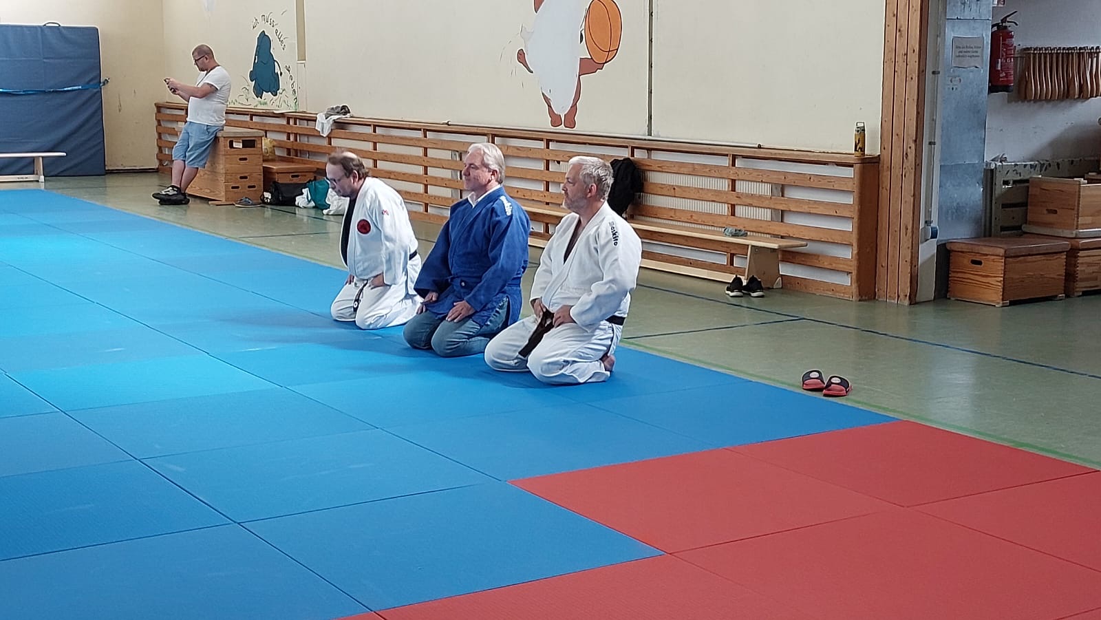 Der OB Marc Buchholz im blauen Judogi beim Angrüßen zwischen unseren Trainern Tim und Volker.