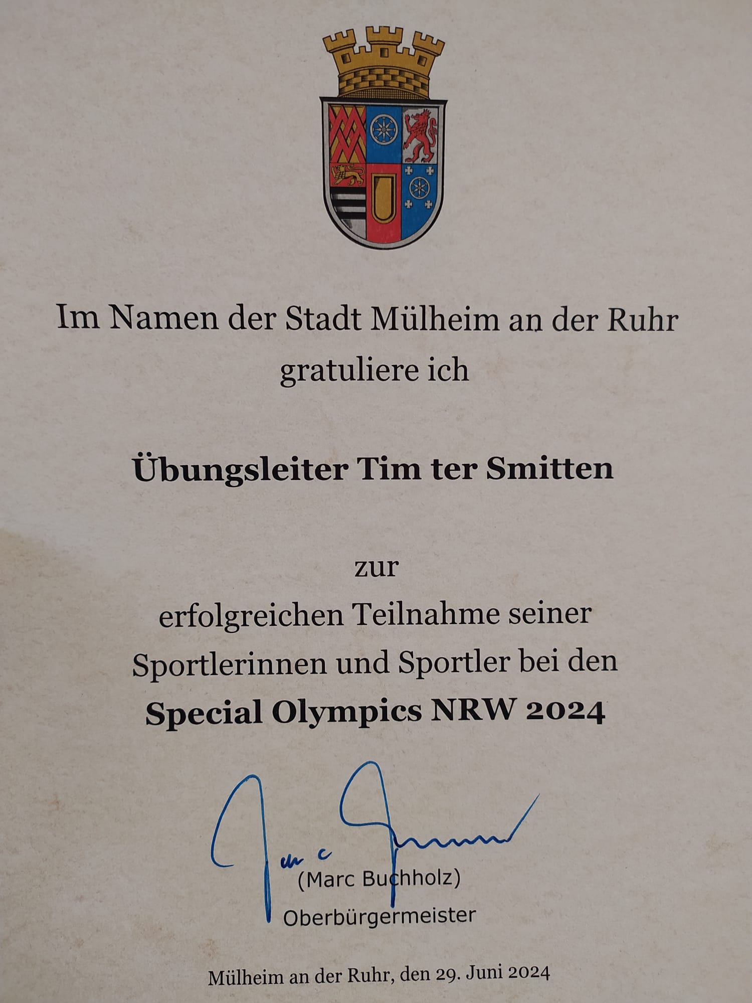 Der Oberbürgermeister der Stadt Mülheim, Marc Buchholz, der die Schirmherrschaft für die Teilnahme unserer ID-Judoka zu den Landesspielen in Münster übernommen hatte, besuchte am Samstag unser Training und überreichte Urkunden als Anerkennung der sportlichen Erfolge der Judoka und der Trainer in Münster.