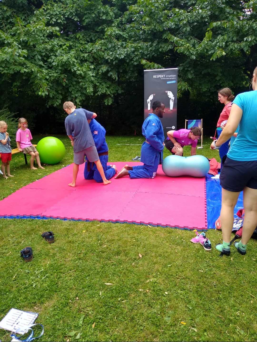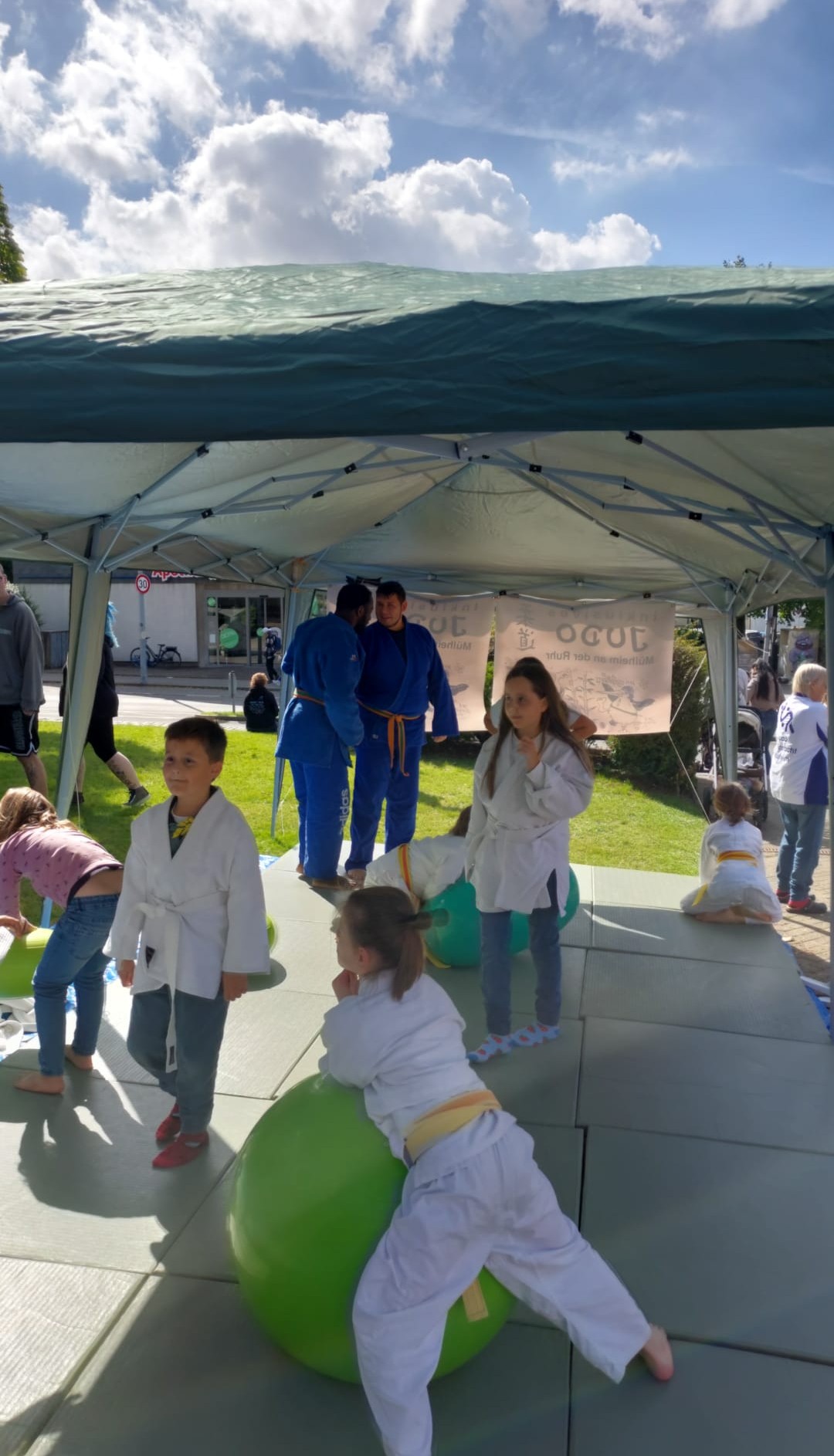 Hier bauen wir seit letztem Jahr unseren eigenen Judopavillon auf. Auf einer Fläche 3x7 doppel gelegten Judomatten können sich Kinder, Jugendliche, Eltern und Großeltern an einem Mitmach-Angebot aus dem Judo-Bereich versuchen. Judorolle über einen Pezziball, Rückwärtsrolle oder ein kleines Randori (Wettkampf), alles unter fachkundiger Aufsicht.