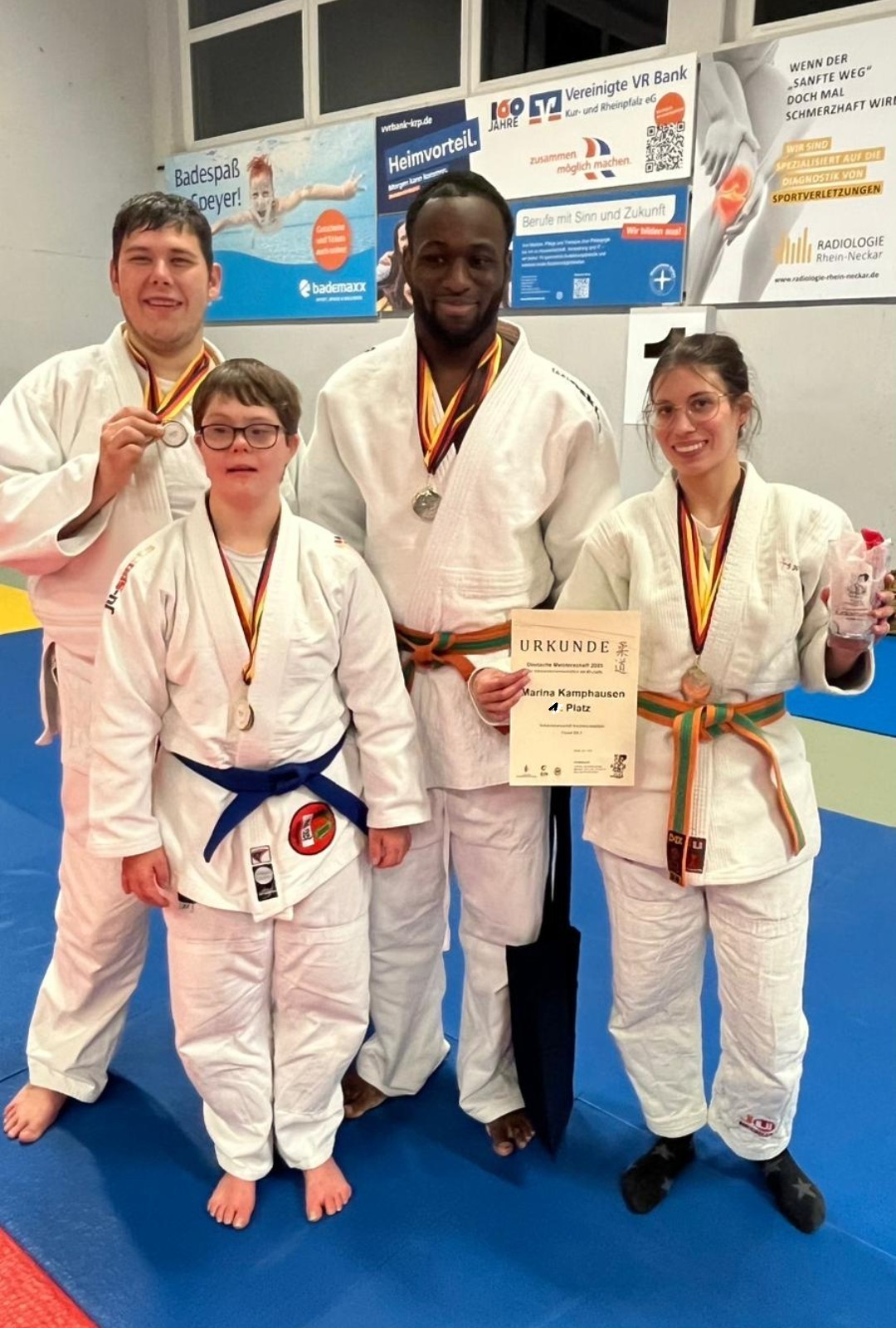 Bei den Deutschen Meisterschaften ID-Judo 2025 in Speyer/RLP der Verbandsmannschaften belegen Lisa Heise, Marina Kamphausen, Marc Behrendt und Solomon Schramm im Mixed Team NRW den ersten Platz.